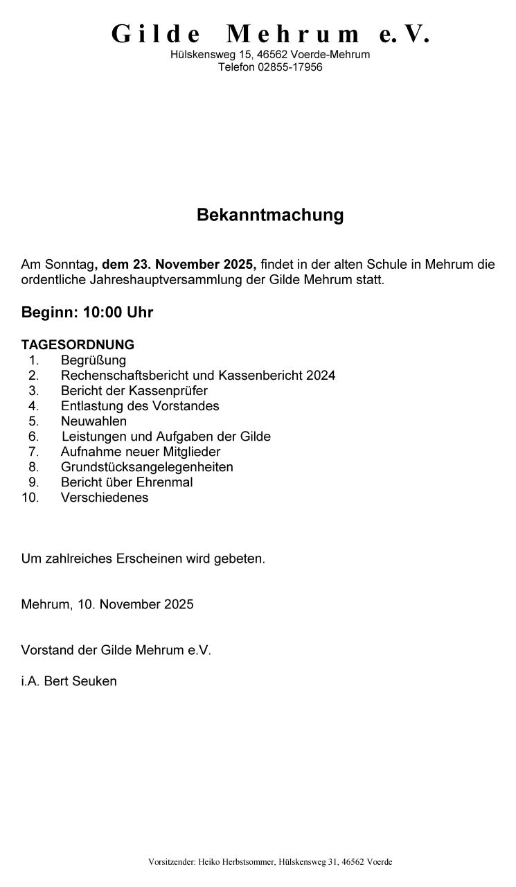 Am Sonntag, dem 23. November 2025, findet in der alten Schule in Mehrum die ordentliche Jahreshauptversammlung der Gilde Mehrum statt.